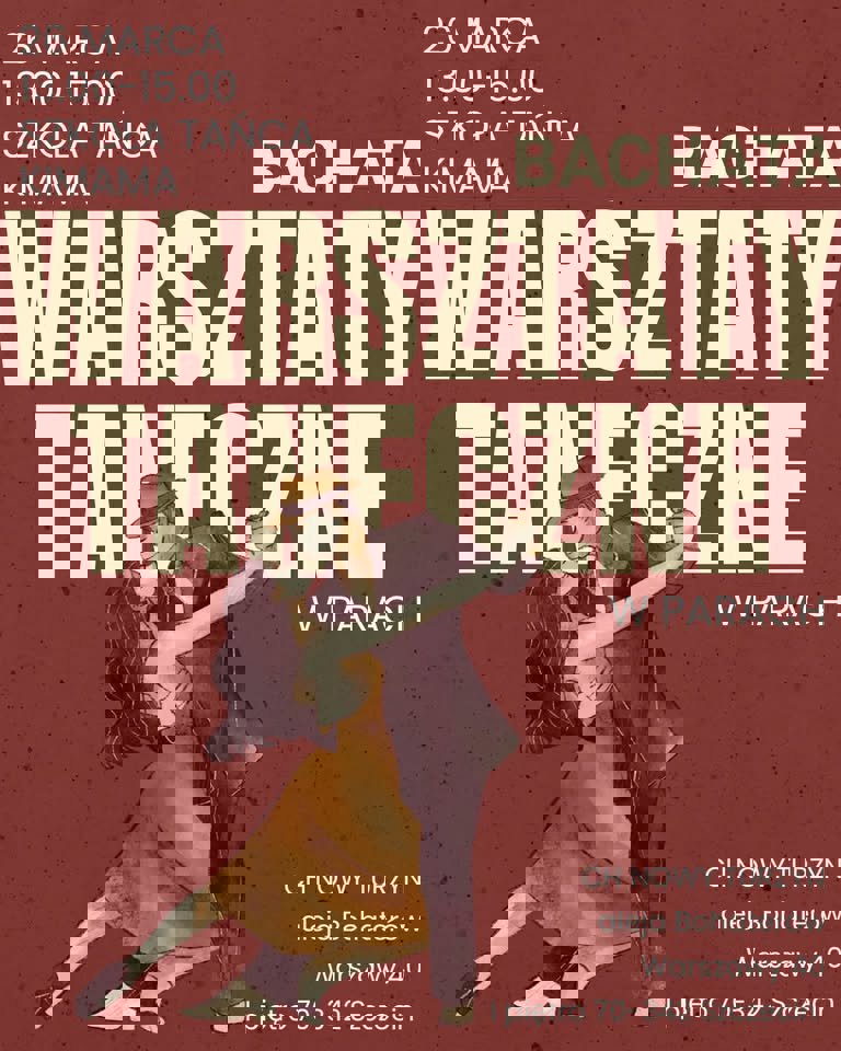 Warsztaty z Anią Mendak: fandango dla średniozaawansowanych (1,5h), technika stepu (1h) i flamenco orientalne (2,5h). Ceny: 110 zł fandango, 70 zł step, 140 zł orientalne, pakiet 310 zł. Zapisy u Donaty Liszczak tel. 501574991 lub milagroszkolatanca@interia.pl. Poziom średniozaawansowany niższy.